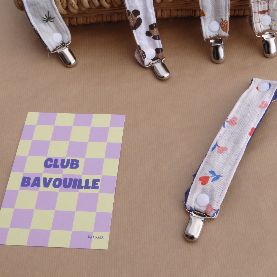 Ce modèle d'attache tétine plein de tendresse reprend le motif du bavoir “bouquet de cœurs” de la collection Arlo. Je l’ai confectionné en coton imprimé doublé d’un verso en nid d’abeille, tout doux contre la peau. Le clip en métal se fixe aux vêtements et les pressions maintiennent la tétine. Un vrai petit cœur d’amour à offrir ou à s’offrir.